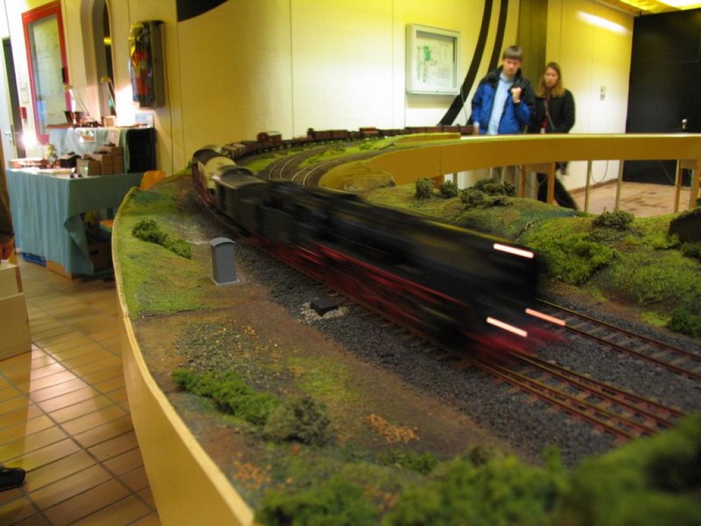 Landschaft auf der Gegengeraden. Dafür zeigen sich einige interessante Fahrzeuge auf der Anlage: Neben dem TransEuropExpress VT 11.5