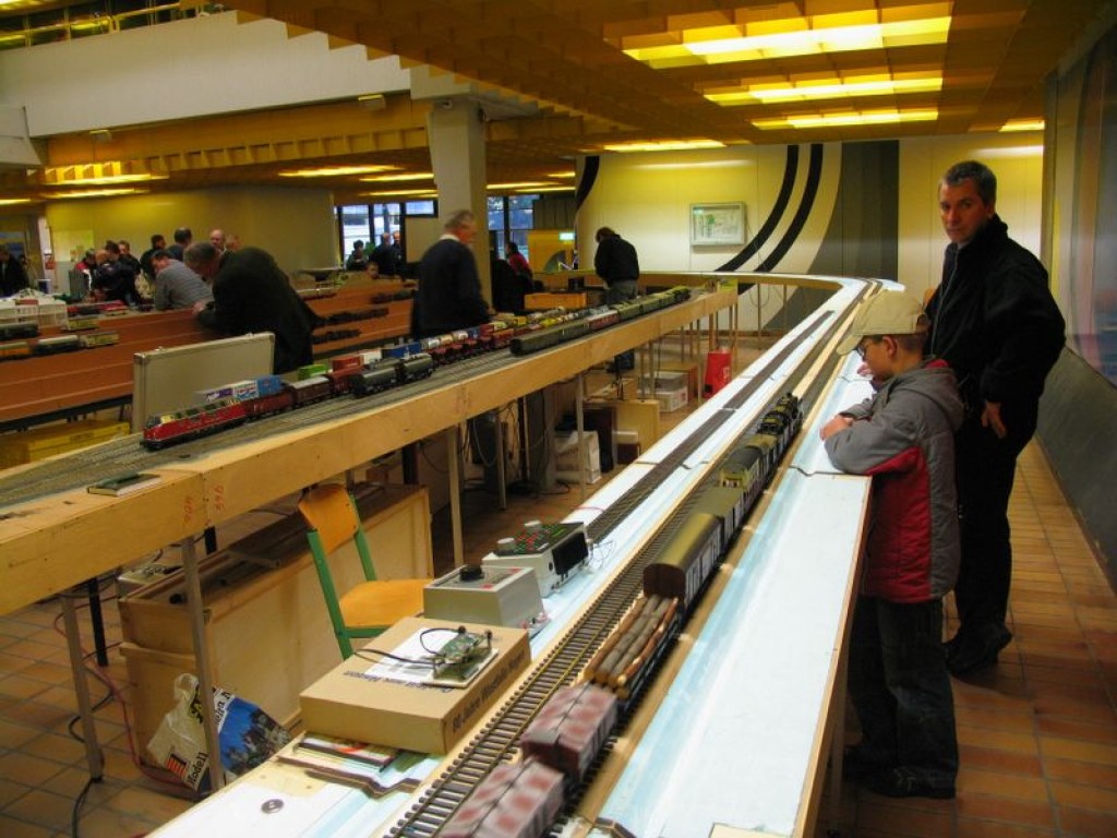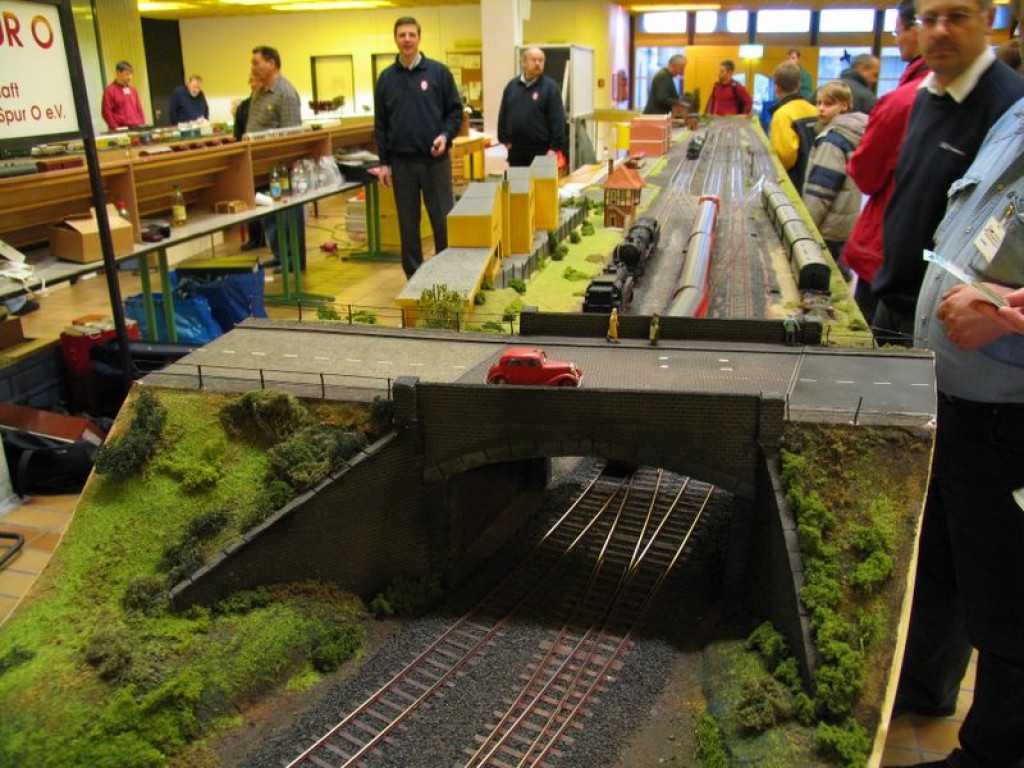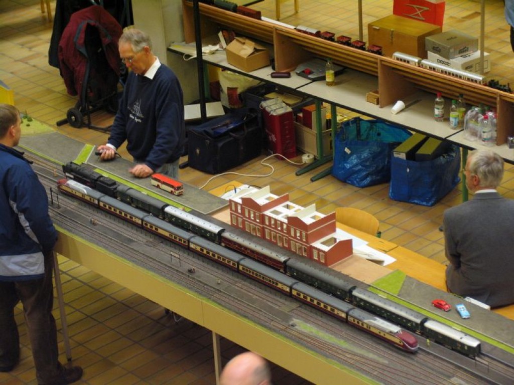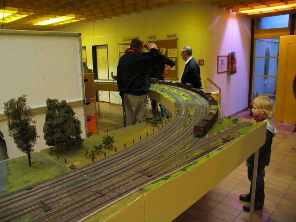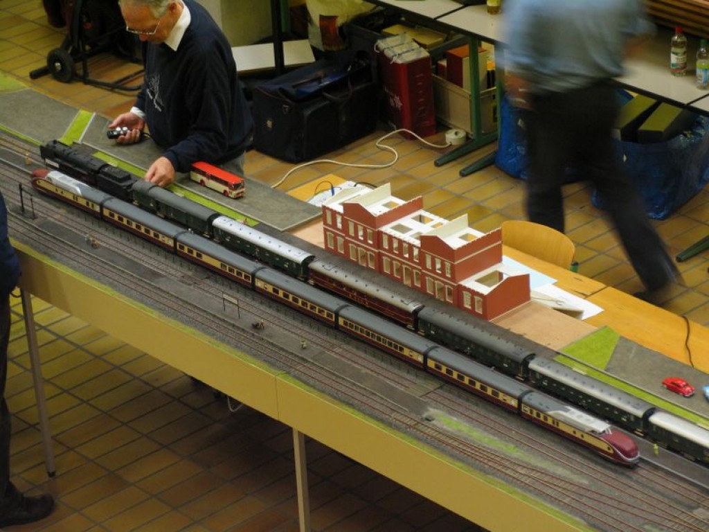 Landschaft auf der Gegengeraden. Dafür zeigen sich einige interessante Fahrzeuge auf der Anlage: Neben dem TransEuropExpress VT 11.5