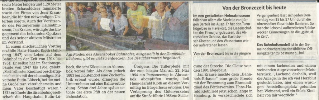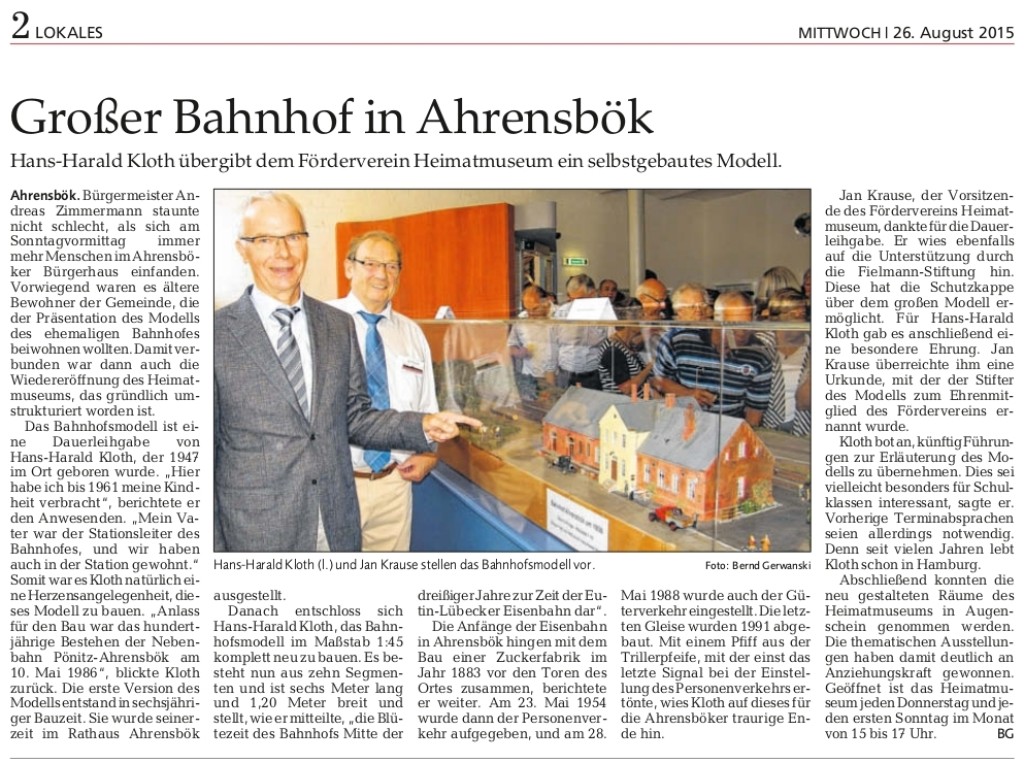 Am Sonntag, dem 23.08.2015 übergab der Erbauer dieses wunderbare Arrangement, historisch belegt, gestalterisch auf allerhöchstem Niveau, dem Heimatmuseum der Großgemeinde Ahrensbök (Foto unten: Heimatmuseum).