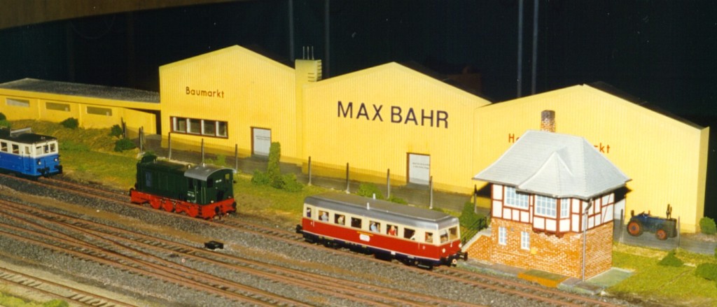 In der westlichen Bahnhofseinfahrt steht noch ein altes Fabrikgebäude in konturloser Landschaft! Und Fahrzeuge glänzen zum Zeitpunkt der Aufnahme, direkt nach dem erstmaligen Aufbau der Anlage zur Ausstellung in Bad Oldesloe, noch durch Abwesenheit.