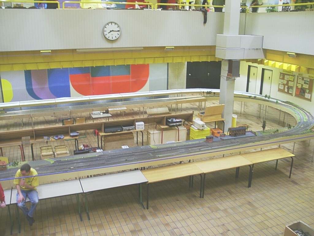 Das letzte Bild, das einzige von der ersten Teilnahme an der Bad Oldesloer Modellbahnaustellung in 2005, dient als Zeugnis einer arbeitsreichen Epoche! Zum ersten Mal werden die neuen Module der Gegengeraden (6 Module mit je 150x60 cm) und der anschließenden Viertelkreise (insgesamt 10 Module) ausgestellt. Offener Rahmen mit stabilen Gleistrassenbrettern und Styroduruntergrund für die Landschaft. Alles noch vollständig ohne Begrünung! Das alte Bahnhofsgebäude war noch gar nicht aufgebaut.