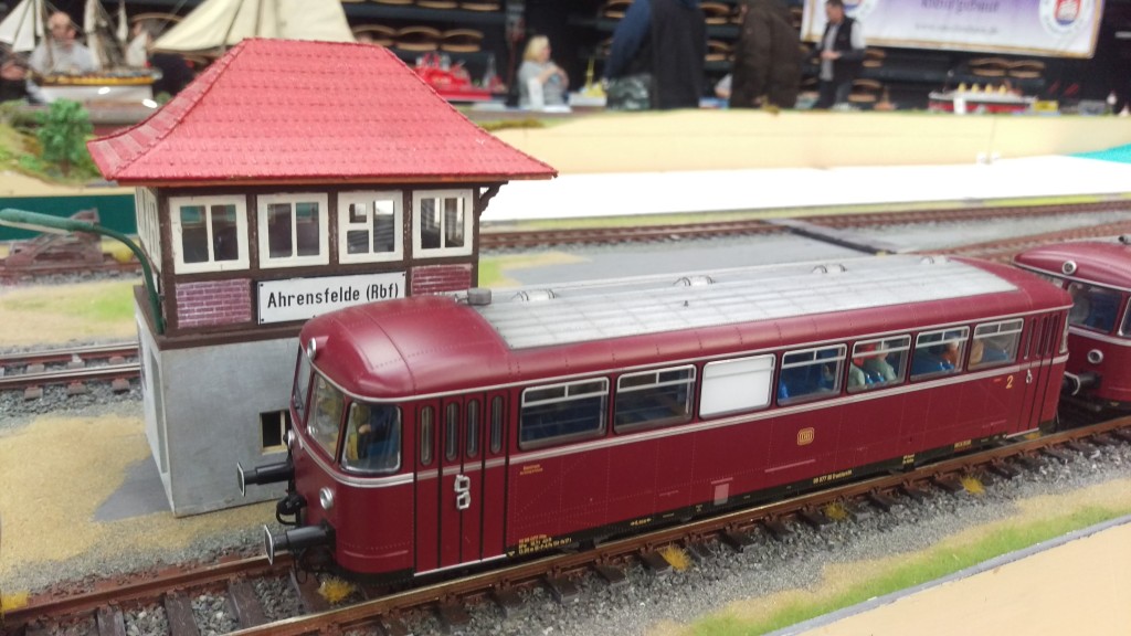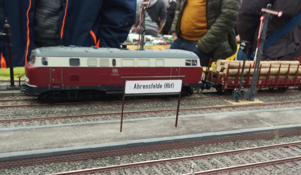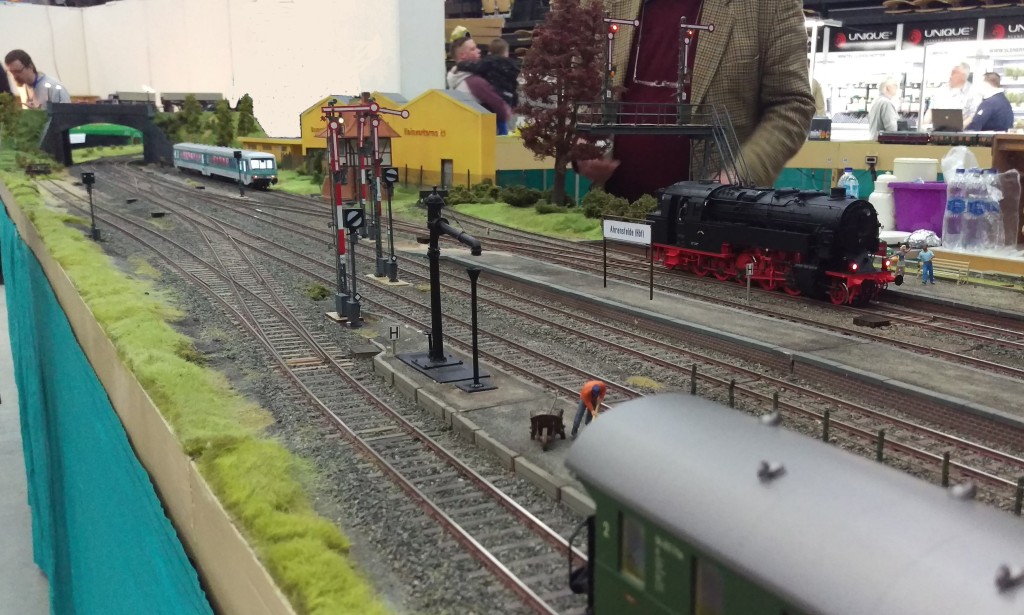 Zum zweiten Mal sind wir mit unserer Anlage in Neumünster dabei. Diese Ausstellung präsentiert nicht nur Modellbahn, sondern lockt u.a. auch Hobbykollegen aus den Bereichen Schiffs-, Flug- und Automodellbau in zahlreichen Ausprägungen an. Die Vorführungen der Modell-Trucks, -Rennwagen oder -Schiffe (im großen Wasserbecken) bringt auch die Modelleisenbahner mal dazu über den eigenen Hobbyrand hinüberzusehen... Leider hat das auch dazu geführt, dass bei uns wenig von doch zahlreich bewegten Fahrzeugen fotografiert wurden. Für alle die mehr von Bau und Einsatz unserer neuen Formsignale (oder den bereits älteren Lichtsignalen wissen möchten) gibt's einen neuen, noch auszubauenden, eigenen Abschnitt unter „Die Anlage – Signale“.