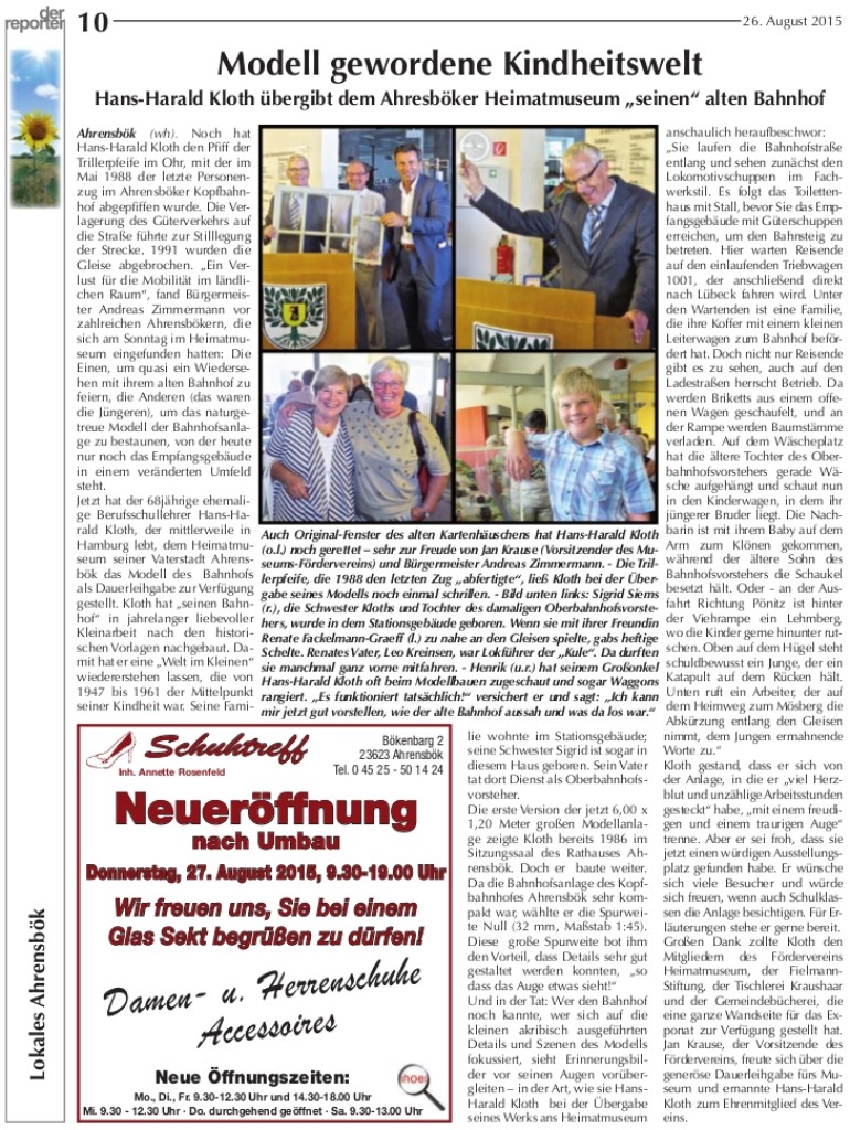 An dieser Stelle wollen wir nicht die vielen Zeilen, die zu diesem Tag geschrieben wurden, wiederholen, sondern es für alle durch die Artikel aus "der reporter" (Sidebar Galerie Bild 1), den "Lübecker Nachrichten" (Sidebar Galerie Bild 2 und 3) und dem "Wochenspiegel" vom 26.08.2015 erlebbar halten. Auch der Hinweis auf den umfangreich bebilderten Artikel im SNM-online vergessen wir nicht.