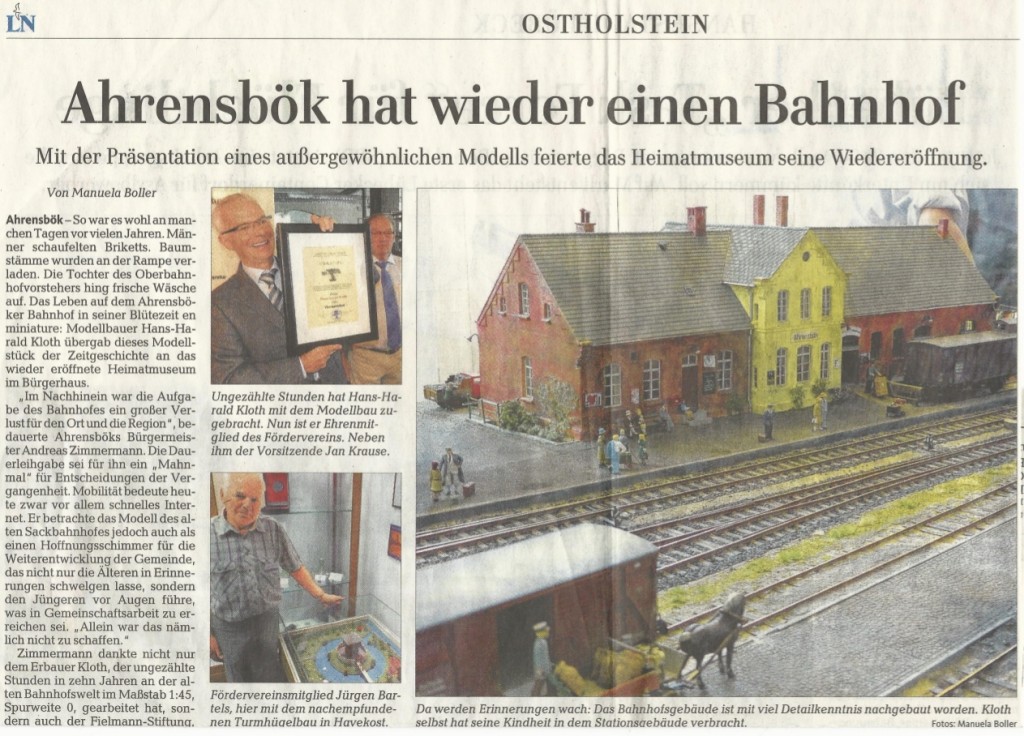 Am Sonntag, dem 23.08.2015 übergab der Erbauer dieses wunderbare Arrangement, historisch belegt, gestalterisch auf allerhöchstem Niveau, dem Heimatmuseum der Großgemeinde Ahrensbök (Foto unten: Heimatmuseum).
